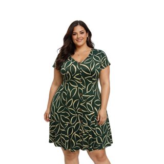 Vestido Midi Plus Size Folhagem Verde com Botões Frontais Tecido Leve Fresco Confortável Extra Bom