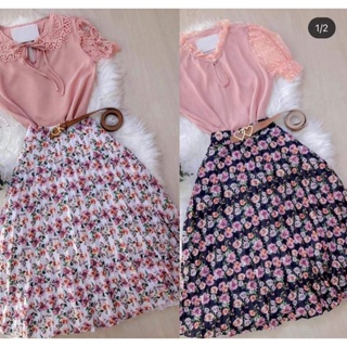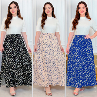 Saia Plissada Midi Elegante Cintura Alta FIor-046