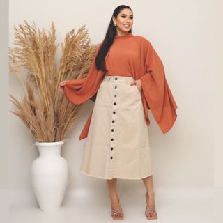 Saia Jeans No Creme Longa Luxo Cintura Alta Com Botões Feminina Evangélica Sem Lycra
