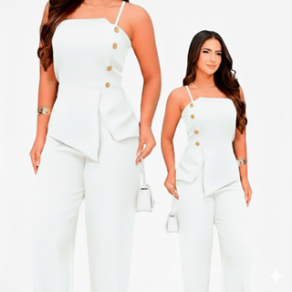 Conjunto Femenino SocialSara Blusa caimento Assimétrica com Bojo e Calça Pantalona com Elastico na Costa Social Elegante