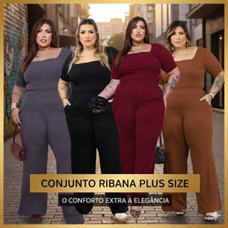 Conjunto Plus Size Feminino calça Pantalona wide leg Blusa Decote Quadrado casual alta elasticidade