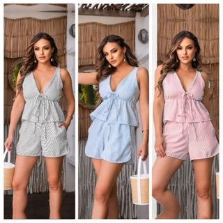 Conjunto Listrado feminino cropped babado amarrar short soltinho