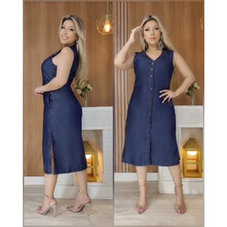 vestido midi sem mangas jeans escuro com bolsos laterais botões funcionais na frente veste até 48