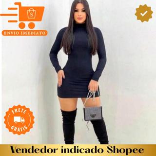 Vestido manga longa curto tubinho gola alta malha canelado Promoção para o frio