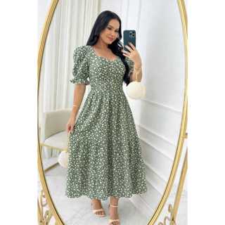 Vestido feminino mídi manga princesa com elastex na costas confortável tecido leve