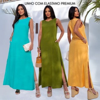 vestido feminino elegante em linho com elastano e forro com duas fendas nas laterais