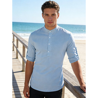 Camisa De Linho Masculina Manga Comprida Slim Fit Gola Padre