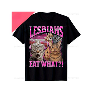 Camiseta Unissex What Do Lesbians Eat Cat Print Pink Lettering Gato Transfer Térmico Confortável Divertida Estilosa