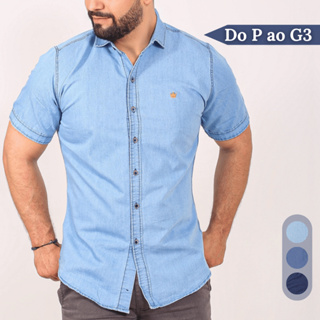 Camisa Social Jeans Masculina Lisa Básica Manga Curta Casual Formal Slim