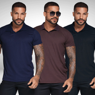 Kit 3 Camiseta Gola Italiana Com Decote Em V Polo Canelada Texturizada