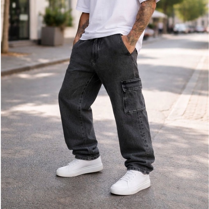 Calça Cargo Masculina Grafite Preta Azul Larga Sarja Jeans Bolsos Laterais