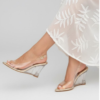 Sandalia salto anabela plataforma transparente acrilico vinil abotoar