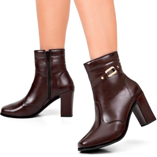 Bota Feminina Lumiss Cano Baixo Salto Alto Bloco Bico Quadrado Passante Marrom