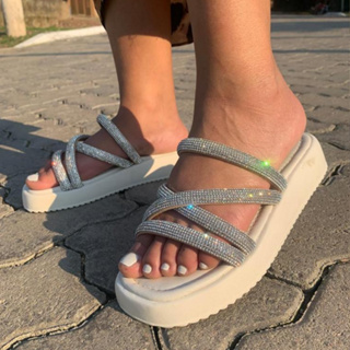 Papete feminina tiras em x cruzadas Birken Strass trançada Brilho Flatform alta
