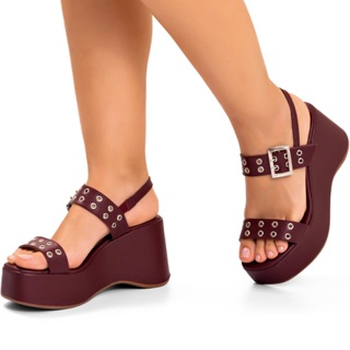 Sandália Feminina Lumiss Fivela Ilhós Anabela Plataforma Confortável Vermelho Marsala