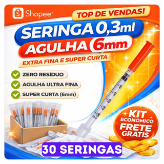 30 Seringas insulina 0,3ml (30UI) c/ Agulha Fixa 6X0,25 CURTA, EXTRA FINA - Botox, Homônios etc - VP