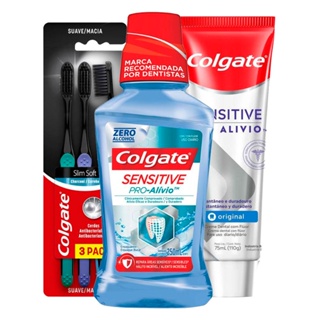 Kit Creme Dental Sensitive Pro-Alívio 110g + Enxaguante Bucal Sensitive Pro-Alívio 250ml + Escova Dental Slim Soft Black 3un