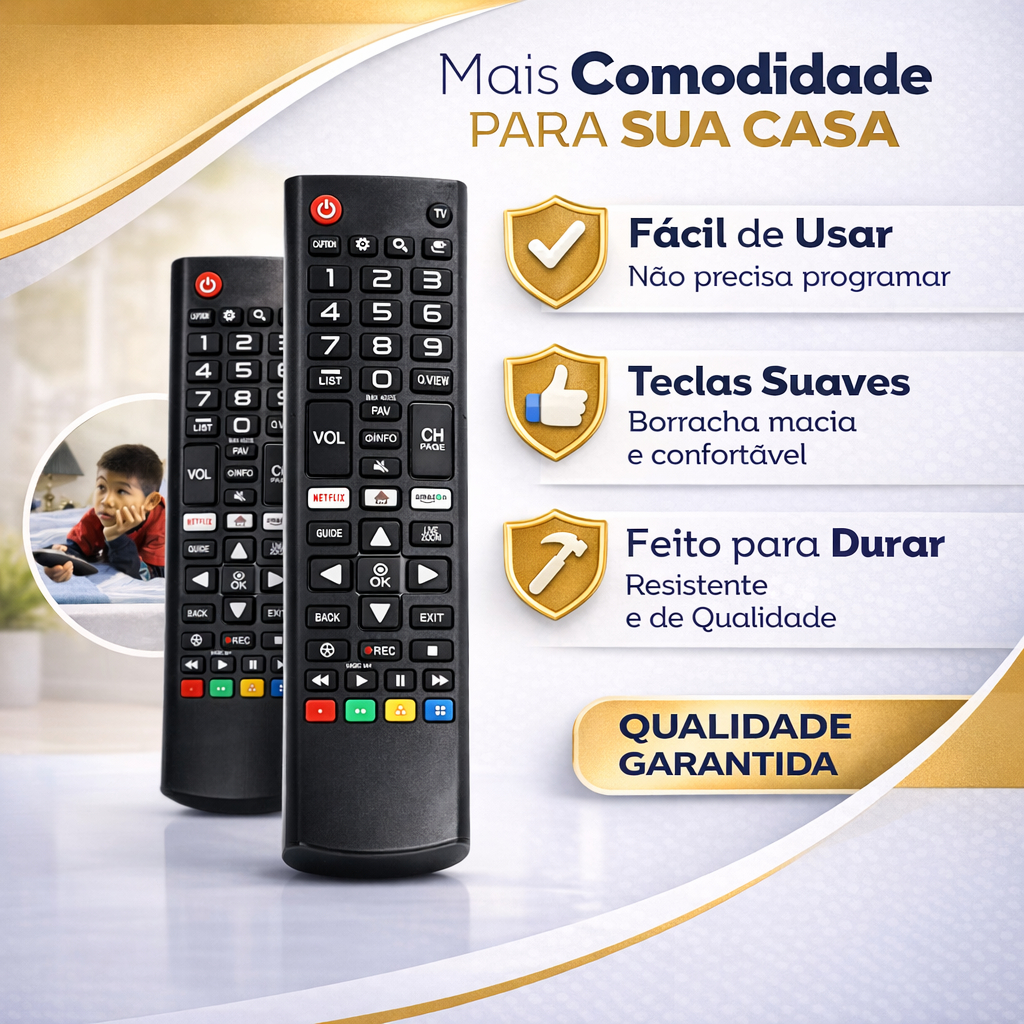 Kit 2 Controles Remoto CompatÃvel LG Smart TV + 4 Pilhas Inclusas Tenha mais praticidade no dia a dia com este kit com 2 controles remotos compatÃveis com TVs LG. Ideal para substituir controles antigos ou ter um controle reserva sempre disponÃvel. O kit já acompanha 4 pilhas, permitindo utilizar os controles assim que receber o produto. â Principais CaracterÃsticas ⢠Kit com 2 controles remotos compatÃveis LG ⢠4 pilhas inclusas ⢠CompatÃvel com TVs Smart, LED, LCD, UHD, OLED, 3D e 4K ⢠Botões de atalho para Netflix e Prime Video ⢠Alcance de até 10â12 metros ⢠Pronto para usar â não precisa configurar ðº Compatibilidade CompatÃvel com diversos controles LG como: AKB75675304, AKB75095315, AKB75375604, AKB75855501, AKB75855505, AKB75055702, AKB74915321, AKB73715613, AKB73715689, AKB74475411 e AKB75675325. Também substitui modelos: LE-7045, SKY8035, SKY-8051, FBG-8035, FBG-7468, HY-319 e HY-336. Funciona com diversas TVs LG como: 32LK615BPSB, 32LK610BPSA, 43LK5700PSC, 42LB5800, 32LB570B, 32LB580B, 32LN540B, 32LN536B, 32LN5400, 39LN5400, 42LN5400, 43UM7300PSA, 32LM620B, 32LM621C, 32LM625B, 43LM6300, 43LM631C, UJ6300 e UK6510. CompatÃvel com TVs LG de 24 até 65 polegadas. â¹ïž Informações Importantes ⢠Produto compatÃvel / similar, não é original LG ⢠Não precisa programação, basta inserir as pilhas ⢠Recomendamos conferir o modelo da TV antes da compra ð Envio ðŠ Produto novo ð§Ÿ Acompanha nota fiscal â¡ Envio imediato após a confirmação do pedido