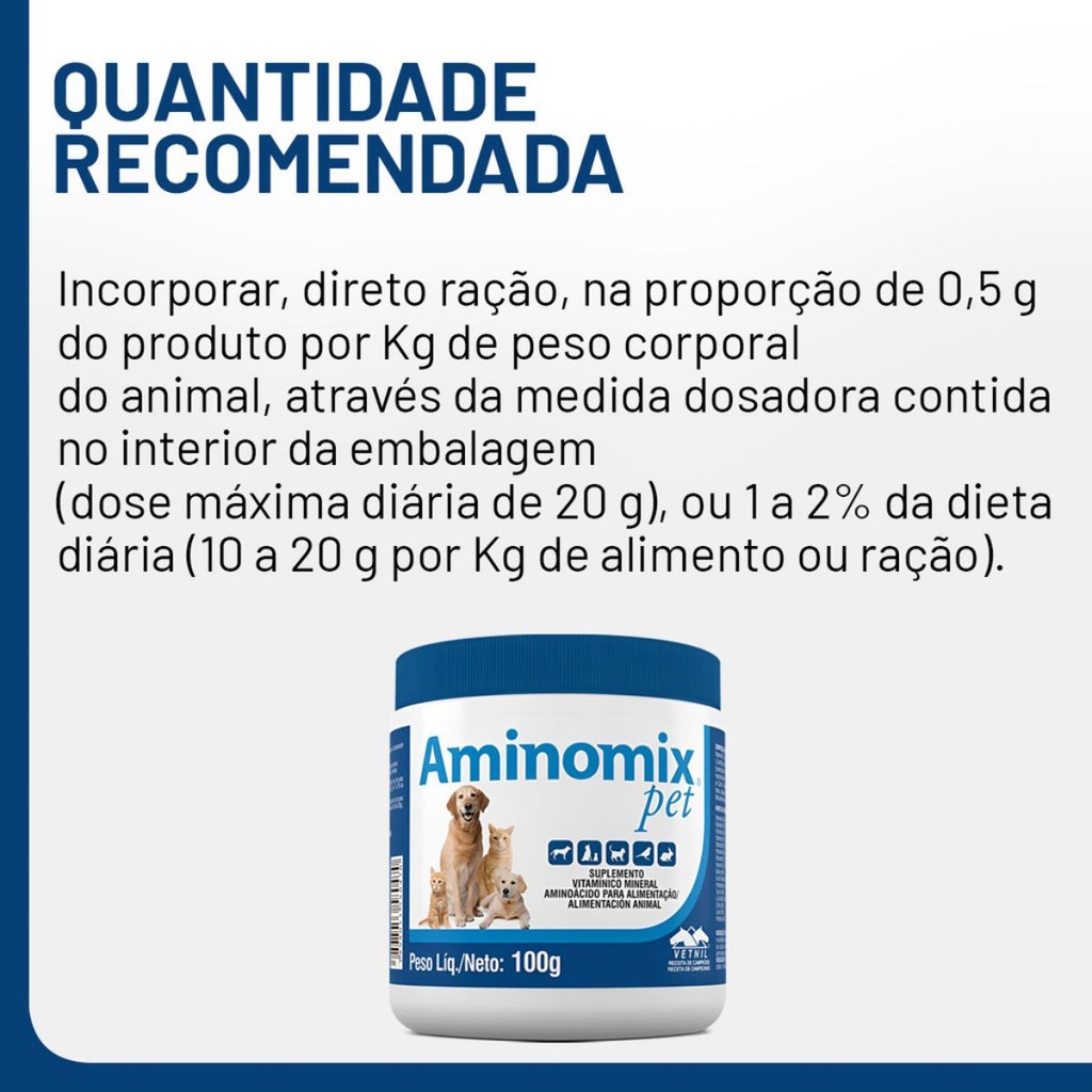 A MANADA ANIMAL é um marketplace de produtos veterinários. É a escolha certa para tutores que prezam pela qualidade dos produtos que seu animal necessita. Tudo com o suporte de uma equipe de veterinários e gestores com mais de 10 anos de experiência no mercado.Fique tranquilo, todos os nossos produtos são originais, adquiridos através de distribuidores credenciados!Ah, e todas as vendas acompanham nota fiscal!MANADA ANIMAL,Tranquilidade pra você, cuidado para ele!_________________________________ CONTÉM 02 Aminomix Pet Suplemento completo para os pets.Aminomix Pet auxilia na melhora da qualidade nutricional dos alimentos (rações, farinhadas, misturas de sementes ou comida caseira), fornecendo as doses essenciais de vitaminas, minerais e aminoácidos, de forma que a criação possa expressar o seu melhor.INDICAÇÃOSuplementação de aminoácidos, vitaminas, macro e microminerais para caninos, felinos, aves, répteis, mustelídeos e roedores. Auxilia na melhora da qualidade nutricional para os animais, na suplementação nas fases críticas da criação (crescimento, desenvolvimento, gestação, lactação e geriatria) e preparo de animais para exposições e melhora da performance de cães em treinamento.MODO DE USARPara ser incorporado ao alimento ou ração. Incorporar na proporção de 0,5 g do produto por kg de peso corporal do animal, através da medida dosadora contida no interior da embalagem (dose máxima diária de 20 g) ou 1 a 2% da dieta diária (10 a 20 g por kg de alimento ou ração).NÍVEIS DE GARANTIA POR kg DO PRODUTOVitamina A (Mín.) 1.000.000 UIVitamina D3 (Mín.) 50.000 UIVitamina E (Mín.) 1.000 UIVitamina B1 (Mín.) 200 mgVitamina B2 (Mín.) 200 mgVitamina B6 (Mín.) 100 mgVitamina B12 (Mín.) 2.000 mcgVitamina C (Mín.) 5.000 mgBiotina (Mín.) 18 mgÁcido Nicotínico (Mín.) 600 mgPantotenato de Cálcio (Mín.) 400 mgTaurina (Mín.) 1.000 mgL-Carnitina (Mín.) 10 gColina (Mín.) 5.000 mgLisina (Mín.) 14,215 gHistidina (Mín.) 499,74 mgArginina (Mín.) 1.850,5 mgÁcido Aspártico (Mín.) 271,8 mgTreonina (Mín.) 269,3 mgSerina (Mín.) 489,23 mgÁcido Glutâmico (Mín.) 1.350,43 mgProlina (Mín.) 5.131,4 mgGlicina (Mín.) 6.011,8 mgHidroxiprolina (Mín.) 452 mgAlanina (Mín.) 4.055 mgCisteína (Mín.) 124,6 mgValina (Mín.) 1.183,5 mgMetionina (Mín.) 9.370,6 mgIsoleucina (Mín.) 561,2 mgLeucina (Mín.) 1.461 mgTirosina (Mín.) 444,3 mgFenilalanina (Mín.) 881,1 mgTriptofano (Mín.) 89,7 mgSaccharomyces cerevisiae 9 x 10 UFCÁcido Fólico (Mín.) 1.000 mgMagnésio (Mín.) 12,6 gEnxofre (Mín.) 200 mgIodo (Mín.) 93 mgFerro (Mín.) 112 mgCobalto (Mín.) 40 mgCobre (Mín.) 75 mgZinco (Mín.) 1.700 mgManganês (Mín.) 340 mgSelênio (Mín.) 10 mgCálcio (Mín.) / (Máx.) 150,5 g / 157 gFósforo (Mín.) 74,8 gSódio (Mín.) 2.100 mgAPRESENTAÇÃOPotes contendo 100 g e 500 g, com medida dosadora.