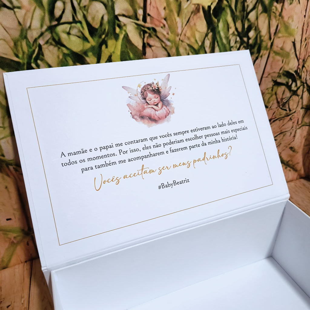 Encante em cada detalhe com nossas caixas cartonadas personalizadas, ideais para momentos especiais como casamentos, convite de padrinhos, batizados e celebrações religiosas. 📦 Detalhes do produto: • Quantidade: 02 unidades • Medidas: 27 x 17 x 8 cm • Material: Caixa cartonada rígida, resistente e de alto padrão • Acabamento: Hot Stamping (dourado, prata ou outra cor sob consulta) • Personalização exclusiva com nomes, frases ou monograma 💖 Diferenciais: ✔ Acabamento sofisticado e elegante ✔ Estrutura firme, ideal para lembranças e kits personalizados ✔ Design delicado, perfeito para ocasiões especiais ✔ Produção artesanal, feita com cuidado e carinho 🎁 Ideal para acomodar: • Manuais de padrinhos • Lembranças personalizadas • Terços, toalhinhas e itens religiosos • Chocolates, mini bebidas ou kits especiais ✨ Transforme seu convite em uma experiência inesquecível com uma caixa que transmite amor e significado em cada detalhe.