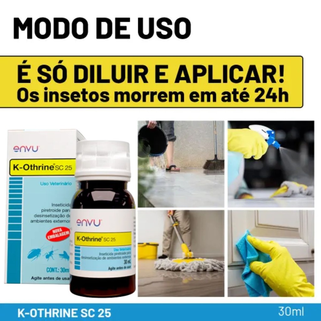 Contém 02 K-OTHRINE SC 25 30 ML Descrição: Inseticida K-Othrine SC 25 Quando estamos em nossas casas, nos sentimos mais tranquilos, não é? E a última coisa que queremos ver ou ouvir são aqueles insetos que podem tirar o nosso sossego. Para isso, o Inseticida promete ser uma ótima solução. O Inseticida K-Othrine SC 25 é um produto líquido que controla os ambientes contra infestações de insetos, sejam eles voadores ou rasteiros. Assim, é uma ótima opção para você que não suporta mais insetos que visitam sua casa e atrapalham todo seu dia a dia. Quando e onde aplicar? O K-Othrine SC é ideal contra Moscas Domésticas, Baratas de Esgoto, Baratas de Cozinha e Formigas Urbanas. O produto pode ser aplicado em esconderijos ou também em locais de trânsito dos insetos. Assim, é possível utilizar o inseticida tanto no interior, como no exterior de sua casa, seja em ralos, rodapés, pisos e outros pontos de atenção. Como aplicar o produto segundo a bula: Diluir o produto em água conforme indicação; Mexer até formar uma mistura homogênea; Colocá-la em um borrifador e agitar antes de aplicar; Retirar adultos, crianças e animais domésticos do local a ser tratado; Aplicar nos locais de passagem, repouso e esconderijos dos insetos; Após aplicação, aguardar a secagem do produto para retornar ao ambiente. Dosagem: 6 mL/ 1L de água para controle de moscas. 8 mL/ 1L de água para controle de baratas e formigas. Fique atento para utilizar o K-Othrine SC 25 Com o objetivo de garantir segurança e eficiência durante o uso, é muito importante seguir a bula do K-Othrine SC 25. Apesar disso, veja abaixo algumas informações essenciais para você utilizar o produto da melhor forma. O inseticida não possui cheiro, não mancha e possibilita uma ação rápida. Porém é importante ficar atento em algumas recomendações: não coma, fume ou beba enquanto utiliza o inseticida; guarde o produto longe do alcance de animais e crianças; e não utilize o produto em quaisquer utensílios de cozinha. ____________________________________________________________________ A MANADA ANIMAL é um marketplace de produtos veterinários. É a escolha certa para tutores que prezam pela qualidade dos produtos que seu animal necessita. Tudo com o suporte de uma equipe de veterinários e gestores com mais de 10 anos de experiência no mercado. Fique tranquilo, todos os nossos produtos são originais, adquiridos através de distribuidores credenciados! Ah, e todas as vendas acompanham nota fiscal! MANADA ANIMAL, Tranquilidade pra você, cuidado para ele! _________________________________
