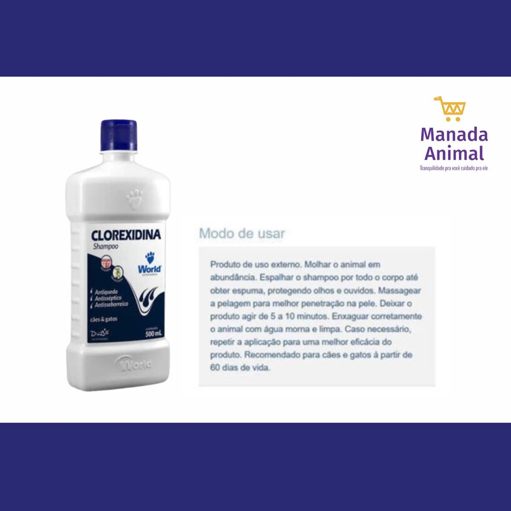 Descrição: CONTÉM 02 SHAMPOO CLOREXIDINA WORLD 500ML - Possui ação como um poderoso antisséptico, antisseborreico, fungicida e antiqueda; - Oferece óleo de jojoba em sua composição, que hidrata e acalma a pele irritada do pet; - Fácil aplicação, mentém pelos macios e perfumados; - Antiquedas, antisséptico e antisseborreico. Detalhes O Shampoo World Veterinária Dug's Clorexidina Cães & Gatos é indicado para a higienização, prevenção e auxílio terapêutico. Colabora na vitalidade da pele e pelo do seu pet. Essa combinação de componentes ativo controla a proliferação de bactérias e fungos, além do óleo de jojoba que ajuda a pele irritada, fortalece o crescimento do fio e hidrata. __________________________________________________________ A MANADA ANIMAL é um marketplace de produtos veterinários. É a escolha certa para tutores que prezam pela qualidade dos produtos que seu animal necessita. Tudo com o suporte de uma equipe de veterinários e gestores com mais de 10 anos de experiência no mercado. Fique tranquilo, todos os nossos produtos são originais, adquiridos através de distribuidores credenciados! Ah, e todas as vendas acompanham nota fiscal! MANADA ANIMAL, Tranquilidade pra você, cuidado para ele! ___________________________________