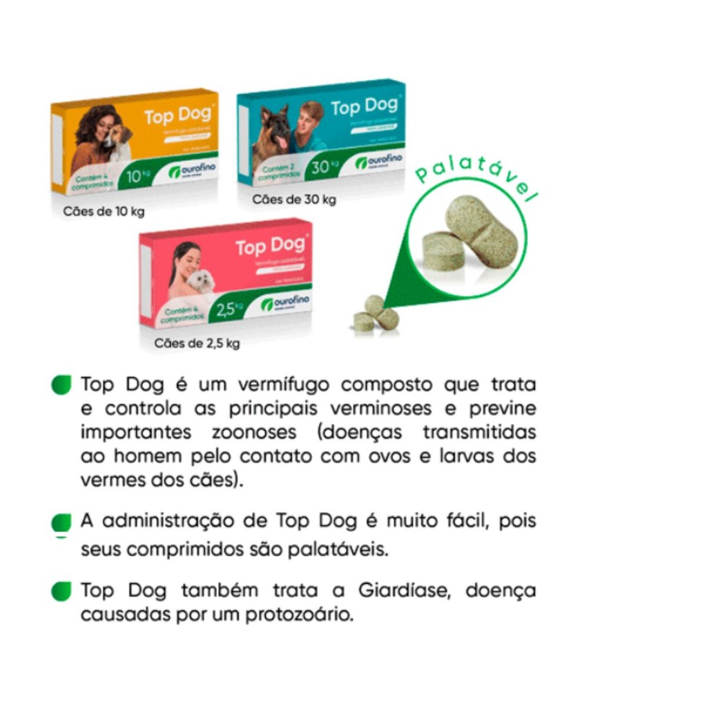A MANADA ANIMAL é um marketplace de produtos veterinários. É a escolha certa para tutores que prezam pela qualidade dos produtos que seu animal necessita. Tudo com o suporte de uma equipe de veterinários e gestores com mais de 10 anos de experiência no mercado. Fique tranquilo, todos os nossos produtos são originais, adquiridos através de distribuidores credenciados! Ah, e todas as vendas acompanham nota fiscal! MANADA ANIMAL, Tranquilidade pra você, cuidado para ele! _________________________________________ CONTÉM 02 CARTELAS COM 2 COMPRIMIDOS CADA! Indicações: Top Dog é um vermífugo palatável, indicado para o controle de parasitas internos (helmintos) com atuação em vermes redondos (nematódeos) e vermes chatos (cestódeos). Top Dog é também indicado para o tratamento da Giardíase (causada pelo protozoário Giardia sp). Top Dog é de uso exclusivo para cães. Espectro de ação de Top Dog: Nematódeos Ancylostoma caninum, Toxocara canis. Cestódeos Dipylidium caninum. Protozoários Giardiasp. Top Dog 30,0 kg (3000 mg) Administrar pela via oral 1 comprimido palatável para cada 30 kg de peso corporal.
