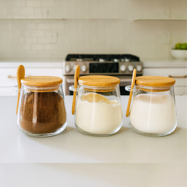 03 Potes De Vidro Oval Tampa e Colher Bambu Hermético 230ml