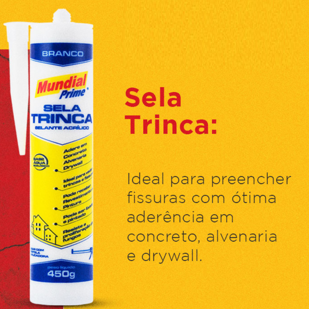 KIT COM 03 SELA TRINCA BRANCO 450GR MUNDIAL PRIME Adesivo vedante acrílico de fácil aplicação, com ótima aderência, alta resistência a intempéries e vedação permanente. Possui fungicida em sua composição, inibindo a proliferação de fungos. Pode ser lixado após a aplicação e também receber revestimento ou pintura. Fissuras em paredes, portas e janelas acabam com o visual de qualquer ambiente, não é mesmo? Elimine essas aberturas com o Sela Trinca da Mundial Prime. De fácil aplicação pode ser utilizado tanto em ambientes internos, na finalização de pias, vasos sanitários e box de banheiro, e também nos ambientes externos, em forros e paredes de gesso, além dos reparos em geral. Finalize acabamentos e reparos com eficiência e sem complicações com o Sela Trinca da Mundial Prime. Instruções de uso Remover todos os resíduos de materiais que não estão aderidos suficientemente às camadas. Importante: a largura e a profundidade máxima das fissuras devem ser de 2 mm, visto que fendas maiores podem indicar problemas estruturais. Deixar a superfície seca, limpa e livre de poeira antes de realizar a aplicação. Cortar a ponta do cartucho e do bico aplicador na medida desejada. Rosquear o bico no cartucho e colocar na pistola aplicadora. Aplicar o selante de forma a preencher completamente a trinca. Remover o excesso de produto pressionando levemente uma espátula sobre a área aplicada. Após 24 horas, pode ser lixado para dar acabamento. Evitar o contato da superfície com a água durante as primeiras 12 horas. Depois de curado, o selante só é removido mecanicamente. Aplicações É indicado para vedar trincas superficiais e fissuras que possuem pouca movimentação. Adere em concreto, alvenaria e drywall. Precauções Não aplicar em plásticos à base de polietileno, polipropileno, nylon , politetrafluoretileno. Não utilizar em peças que terão contato com alimentos e imersão contínua em meios líquidos. * Fotos e imagens meramente ilustrativas.