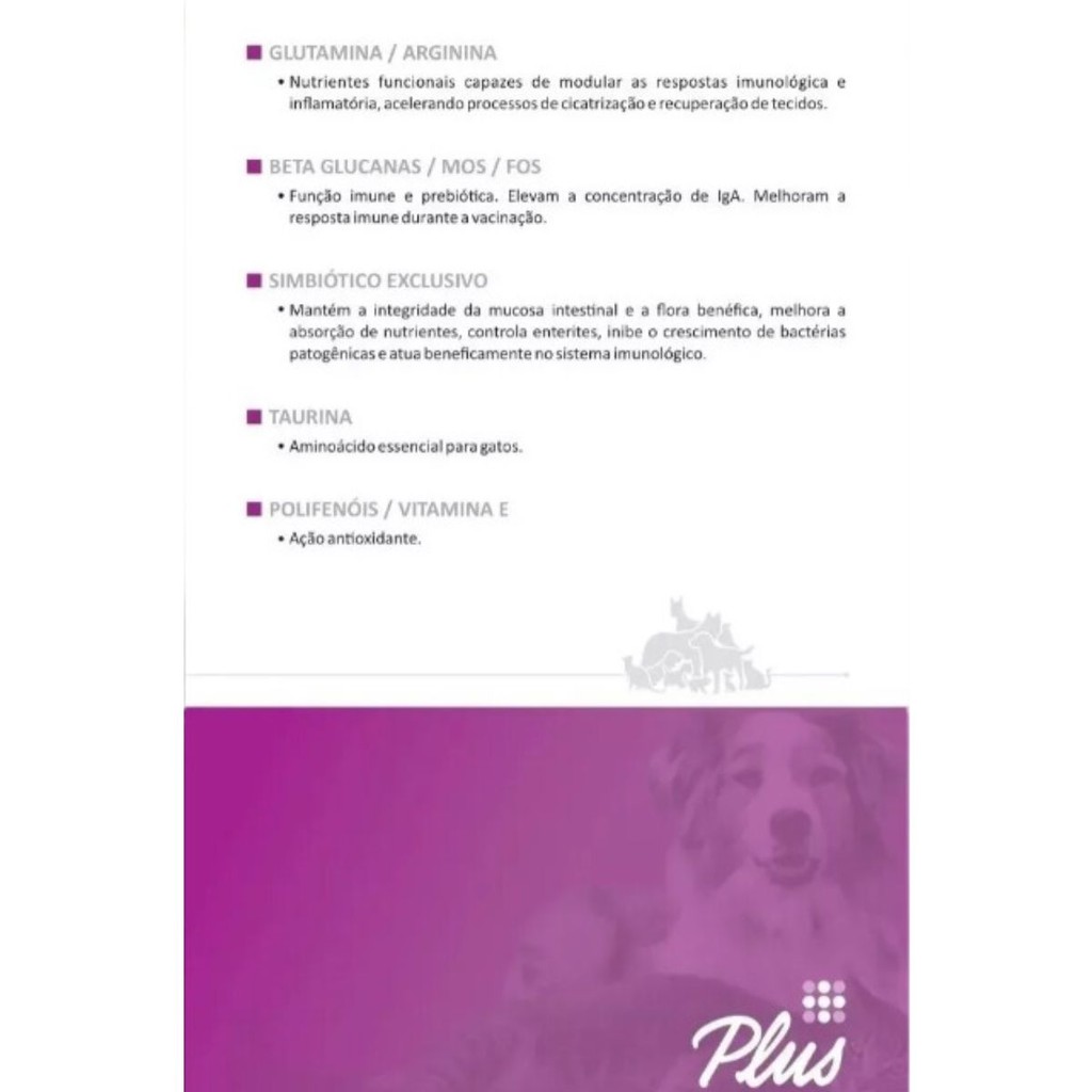 A MANADA ANIMAL é um marketplace de produtos veterinários. É a escolha certa para tutores que prezam pela qualidade dos produtos que seu animal necessita. Tudo com o suporte de uma equipe de veterinários e gestores com mais de 10 anos de experiência no mercado. Fique tranquilo, todos os nossos produtos são originais, adquiridos através de distribuidores credenciados! Ah, e todas as vendas acompanham nota fiscal! MANADA ANIMAL, Tranquilidade pra você, cuidado para ele! _________________________________ CONTÉM 03 Suplemento Vitamínico Nuxcell Plus 2g Cães e Gatos Sobre o produto: Desenvolvido para agir como adjuvante simbiótico ao tratamento clínico de cães e gatos em situações onde haja necessidade de potencializar a resposta imune, tais como vacinações periódicas, uso de anti-helmínticos e patologias específicas. Indicação e sugestões de uso: Indicado para cães e gatos como adjuvante simbiótico na reposição da flora intestinal, vacinações e patologias específicas que necessitem da suplementação com nucleotídeos, glutamina e ácidos graxos poli-insaturados. Vacinações e reforços: 01 dose. A cada dose de vacina. Vermifugação: 01 dose. Associada a cada dose de vermífugo. Animais debilitados e recuperações pós cirúrgicas: 03 doses. Uma por dia, durante três dias consecutivos. As sugestões acima não substituem a indicação do médico veterinário. A prevenção é sempre o melhor caminho. Visitas regulares ao Médico Veterinário são a melhor forma de garantir o bem-estar de seu animal. Consulte a bula de NUXCELL PLUS.