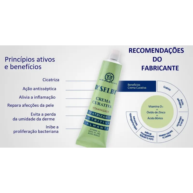 Kit com 4 pomadas de 40g cada Pomada Dr Selby: Dá os melhores resultados em todos os tipos de feridas, queimaduras de qualquer natureza, sol, raios- X, ou substâncias químicas comuns. Também em eczema, frieiras, queimaduras, assaduras, lesões nas dobras, mamilos rachados, lábios rachados, feridas, úlceras, hemorróidas, fungos entre os dedos. Também é indicado nas incisões cirúrgicas para evitar drenagem e acelerar a cicatrização. Ideal para a pele seca e as mãos rachadas. Dr. Selby creme de cura é um produto único de eficácia incomparável, reconhecida e recomendada por profissionais e consumidores através de gerações. Sua fórmula exclusiva, por mais de 60 anos, garante a proteção da pele para toda a família de uma forma segura e eficaz. Seu alto poder hidratante e cura a torna um must-have para muitas situações cotidianas e em todas as fases da vida que suaviza e protege a pele de todos os membros da família, quando necessário. Para Bebês: - Sua fórmula delicada protege e cura da pele do bebê, impedindo excemas, assaduras e pele rachada. Seu conteúdo lanolina age formando uma película que isola a área de irritação e escadadura. Para Crianças: - É a solução perfeita para as crianças pequenas lesões durante os jogos ou atividades. Pele fica pequenas queimaduras, queimaduras solares, arranhões e ferimentos leves, também trabalha também com o alívio e cura de picadas de insetos. Para adultos: - É recomendado para o tratamento de queimaduras, intertigos, pele seca, mãos e raspaduras rachados, eritema por agentes químicos, xerose e hiperqueratose processo e pé de atleta. Para as mães é ideal para seios em fendas que tratam produzidos durante a amamentação bico do peito. Para Idosos: - Ele é usado de forma eficaz na prevenção de escaras e úlceras de decúbito, irritação incontinência, pele seca ou irritada, coceira, abrasões, colostomia irritação, etc.