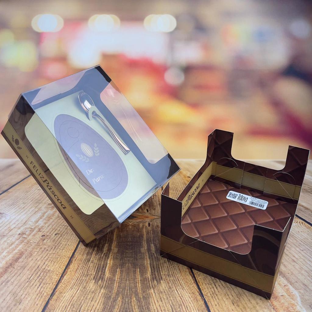 CAIXA ENCANTO 2X1 150G DUPLA-FACE - PASCOA ELEGANCE 4781 *NÃO ACOMPANHA COLHER! C11,5 x L16 x A8 Caixa para ovo de Páscoa com tampa transparente, desenvolvida para apresentação e proteção de produtos artesanais e personalizados. Fabricada com base rígida de alta resistência e visor em material cristal, proporciona excelente visibilidade do conteúdo sem necessidade de abertura. Possui espaço interno ideal para acomodar ovo de chocolate e colher, além de cartão “De/Para”, facilitando a personalização. Indicada para confeiteiros, chocolaterias, lojas especializadas e ações corporativas, agregando valor ao produto final e padronização na entrega.