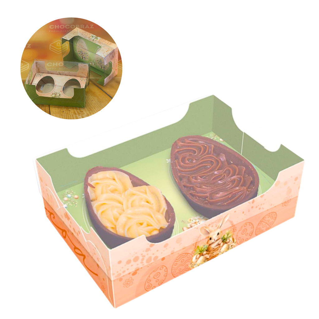 CAIXAS DEGUSTAÇÃO ENCANTO 2 X 50G - COELHINHO ENCANTADO - DUPLA FACE SÃO EMBALAGENS ENCANTADORAS E PRÁTICAS, IDEAL PARA EXIBIR E PRESENTEAR DOIS OVOS DE CHOCOLATE DE 50G. COM DESIGN TEMÁTICO DE COELHINHO ENCANTADO, A CAIXA POSSUI ILUSTRAÇÕES FOFA E DIVERTIDAS, QUE ADICIONAM UM TOQUE FESTIVO À PÁSCOA. A ESTRUTURA DUPLA FACE PERMITE VARIAR A APRESENTAÇÃO, PROPORCIONANDO 2 OPÇÕES VISUAIS. FEITA EM MATERIAL RESISTENTE, GARANTE SEGURANÇA E PROTEÇÃO AO PRODUTO, SENDO UMA EXCELENTE OPÇÃO PARA PRESENTES OU COMERCIALIZAÇÃO NA PÁSCOA. MEDIDAS: 11,5X8X5 CM - PARA 2 OVOS DE 50G ATENÇÃO: - NÃO ACOMPANHA CHOCOLATES