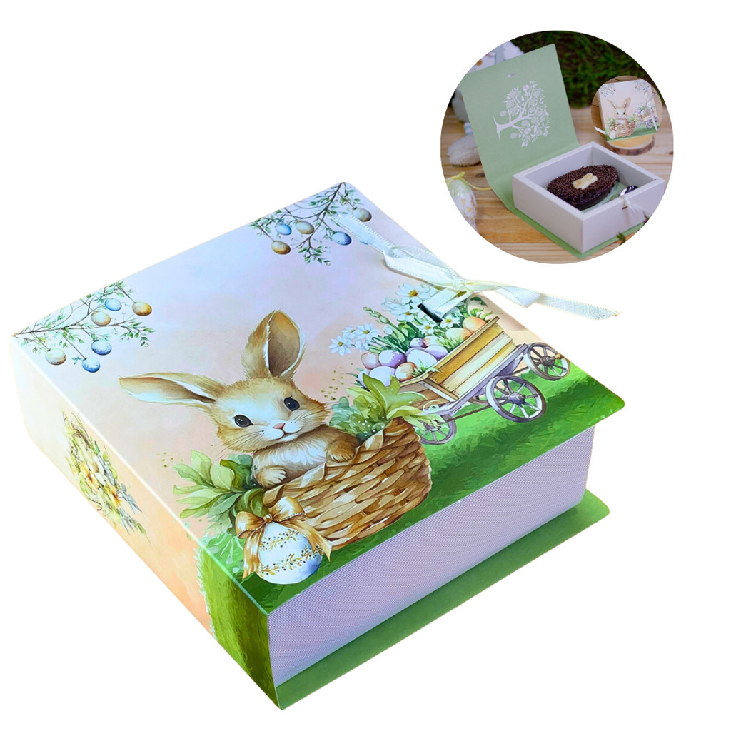 CAIXAS LIVRO P/ OVO DE COLHER 100/150G - COELHINHO ENCANTADO SÃO EMBALAGENS ENCANTADORAS E PRÁTICAS, IDEAL PARA OVOS DE COLHER DE 100G A 150G. COM DESIGN FOFO DE COELHINHO ENCANTADO, A CAIXA POSSUI ILUSTRAÇÕES ALEGRES E TEMÁTICAS DA PÁSCOA, QUE ADICIONAM UM TOQUE FESTIVO. O FORMATO LIVRO PROPORCIONA UM ENCANTO EXTRA, SENDO FÁCIL DE ABRIR E FECHAR. FEITA EM MATERIAL RESISTENTE, GARANTE PROTEÇÃO AO OVO DE COLHER, SENDO UMA EXCELENTE OPÇÃO PARA PRESENTEAR OU COMERCIALIZAR NESSA DATA ESPECIAL. - ACOMPANHA FITA - ACOMPANHA TAG MEDIDAS: 16X15X5 CM ATENÇÃO: - NÃO ACOMPANHA A COLHER - NÃO ACOMPANHA OS CHOCOLATES