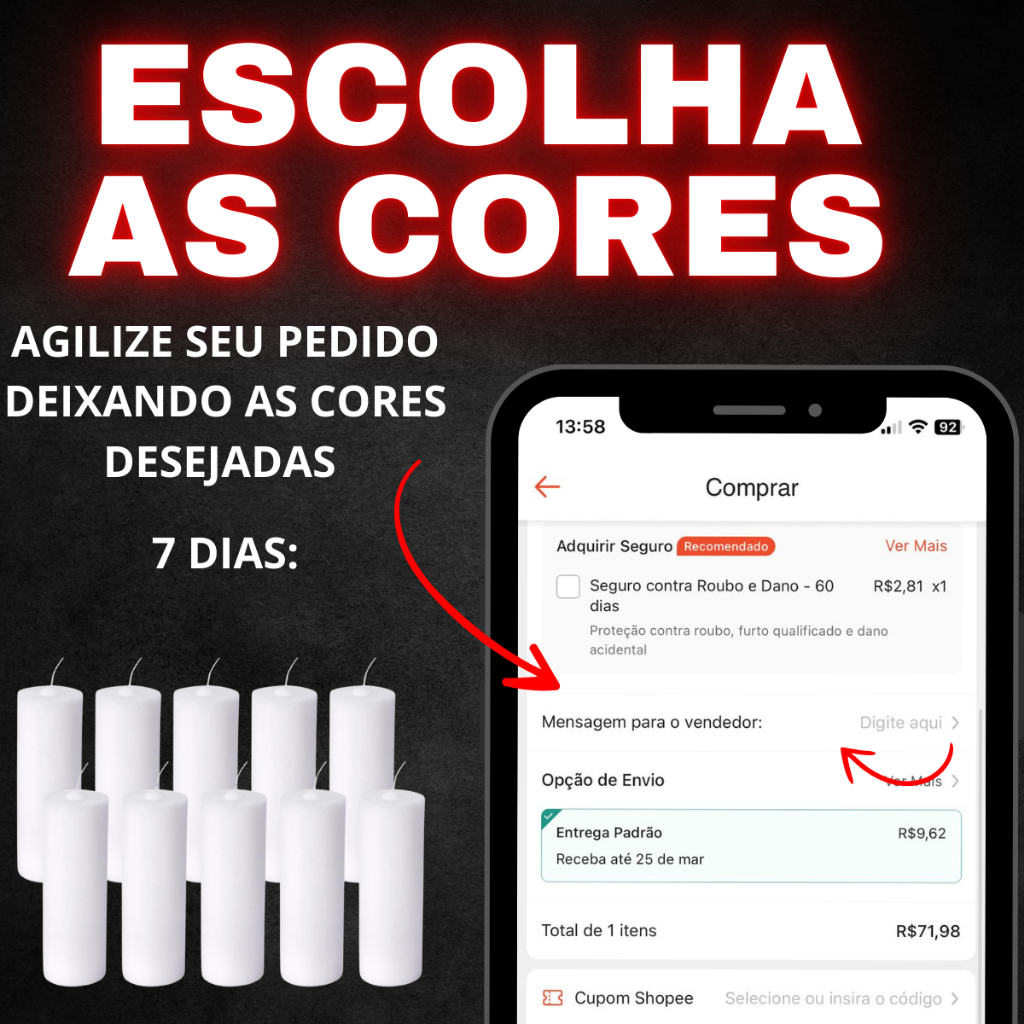 Bem vindo a Pedroso velas QUALIDADE COM PRATICIDADE VOCE ENCONTRA AQUI !! Velas de Parafina 100% Pura! NESTE ANUNCIO VOCE PODE PEDIR VELAS: BICOLOR, COLORIDAS E BRANCAS Facilitamos para você!! AQUI VOCE PODE ESCOLHER AS CORES ATRAVES DO CHAT OU DEIXANDO UMA MESAGEM PARA VENDENDOR ANTES DE FINALIZAR A COMPRA. Velas de 250g durabilidade de 7 dias com cores vibrantes embrulhados no papel celofane, SEM adesivos na embalagem. qualquer duvidas estamos a disposição para melhor atende-los. Cores Disponíveis: Branco/incolor Amarelo Azul claro/celeste Azul escuro/royal Lilás Magenta Laranja Marrom Preto Rosa claro Roxo Verde escuro Vermelho Violeta Bicolores: Amarelo/preto Azul/rosa Branco/azul Branco/preto Branco/verde Branco/vermelho Vermelho/preto e outras sob consulta