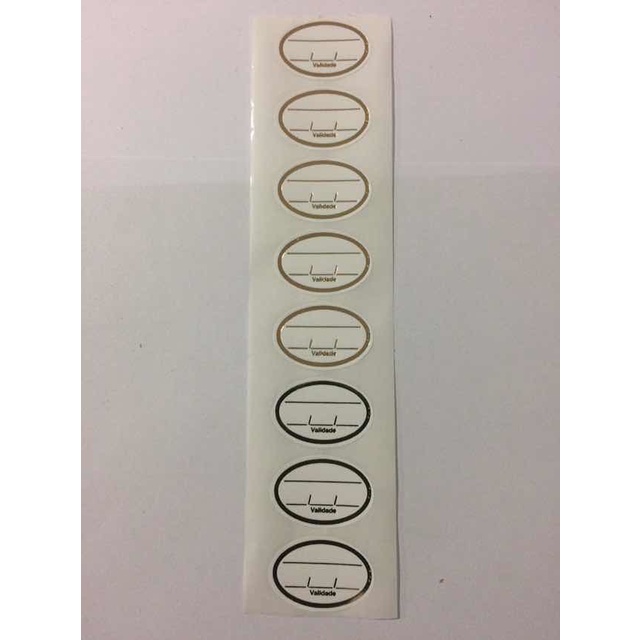 1.000 etiquetas data e validade, tamanho 3,5x2,5 cm, impressas em hot stamping ouro, sobre papel couchê adesivo.