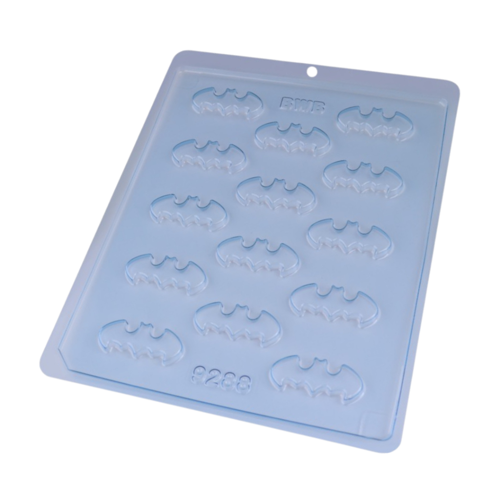 9288 - Morcego Batman (9288) Forma Simples Forma Simples, ideal para produção de chocolates com muita praticidade. Abaixo mais informações do produto. mais informações Descrição do Produto Cavidades: 14 Dimensões (mm): Comp.: 45 x Larg.: 19 x Alt.: 5 Peso Médio: 3g