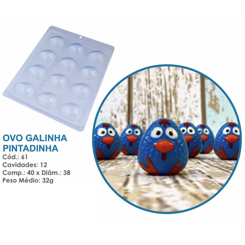 61 - Ovo Galinha Pintadinha (61) Forma Simples Forma Simples, ideal para produção de chocolates com muita praticidade. Abaixo mais informações do produto. mais informações Descrição do Produto Cavidades: 12 Dimensões (mm): Comp.: 40 x Diâm.: 38 Peso Médio: 32g