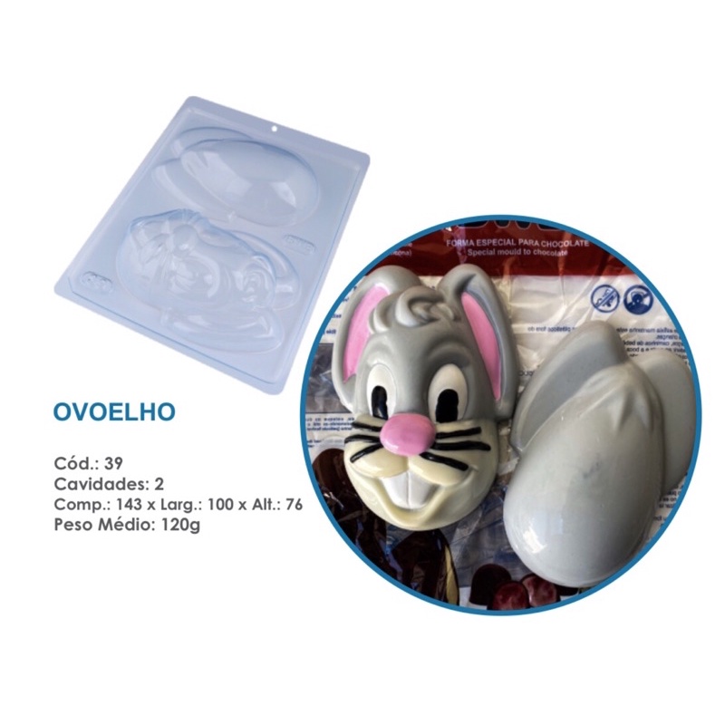 39 - Ovoelho (39) Forma Simples Forma Simples, ideal para produção de chocolates com muita praticidade. Abaixo mais informações do produto. mais informações Descrição do Produto Cavidades: 2 (1 conjunto) Dimensões (mm): Comp.: 40 x Diâm.: 38