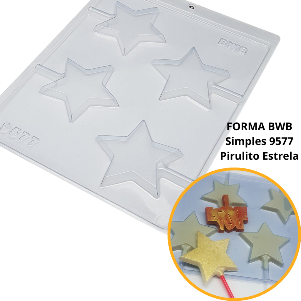 9577 - Pirulito Estrela (9577) Forma Simples 1~10 Forma Simples, ideal para produção de chocolates com muita praticidade. Abaixo mais informações do produto. mais informações Descrição do Produto Cavidades: 4 Dimensões (mm): Comp.: 72 x Larg.: 68 x Alt.: 8 Peso Médio: 18g