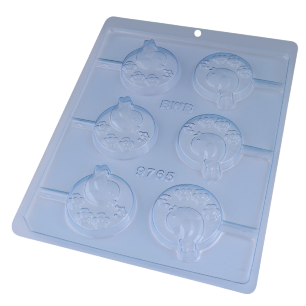 9765 - Pirulito Pássaro Cantando (9765) Forma Simples Forma Simples, ideal para produção de chocolates com muita praticidade. Abaixo mais informações do produto. mais informações Descrição do Produto Cavidades: 6 Dimensões (mm): Comp.: 59 x Larg.: 52,5 x Alt.: 12,5 Peso Médio: 22