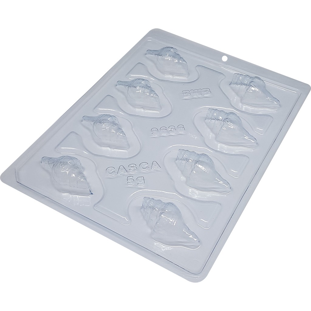 9636 - Concha Caracol (9636) Especial (3 Partes) 1~4 Forma especial com silicone (3 partes), ideal para produção de chocolates com muito mais praticidade e precisão. Abaixo mais informações do produto. mais informações Descrição do Produto Cavidades: 8 Dimensões (mm): Comp.: 51,5 x Larg.: 26,6 x Alt.: 15 Peso Casquinha: 5g Peso Médio: 13g
