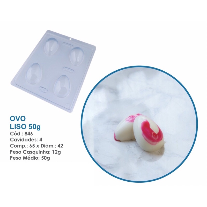 10467 - Ovo Liso 50g Especial (3 Partes) Forma especial com silicone (3 partes), ideal para produção de chocolates com muito mais praticidade e precisão. Abaixo mais informações do produto. mais informações Descrição do Produto Cavidades: 4 Dimensões (mm): Comp.: 65 x Diâm.: 42 Peso Casquinha: 12g Peso Médio: 50g