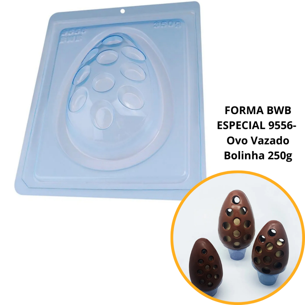 9556 - Ovo Vazado Bolinha 250g (9556) Especial (3 Partes) Forma especial com silicone (3 partes), ideal para produção de chocolates com muito mais praticidade e precisão. Abaixo mais informações do produto. mais informações Descrição do Produto Cavidades: 1 Dimensões (mm): Comp.: 151 x Diâm.: 94 Peso Casquinha: 120g Peso Médio: 250g