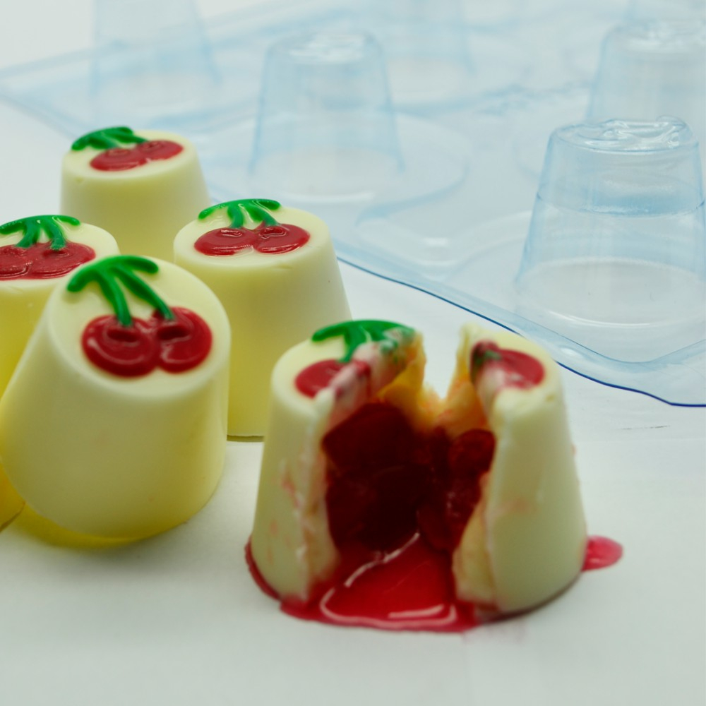 9715 - Bombom Cereja Relevo (9715) Especial (3 Partes) Forma especial com silicone (3 partes), ideal para produção de chocolates com muito mais praticidade e precisão. Abaixo mais informações do produto. mais informações Descrição do Produto Cavidades: 8 Dimensões (mm): Diâm.: 32 x Alt.: 24 Peso Casquinha: 7g Peso Médio: 20g