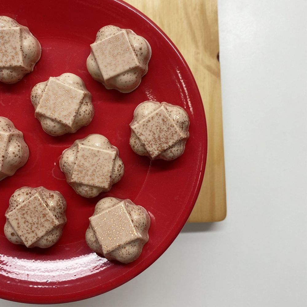 9728 - Bombom Recheado Delicado (9728) Especial (3 Partes) Forma especial com silicone (3 partes), ideal para produção de chocolates com muito mais praticidade e precisão. Abaixo mais informações do produto. mais informações Descrição do Produto Cavidades: 8 Dimensões (mm): Comp.: 33 x Larg.: 33 x Alt.: 12 Peso Casquinha: 7g Peso Médio: 16g