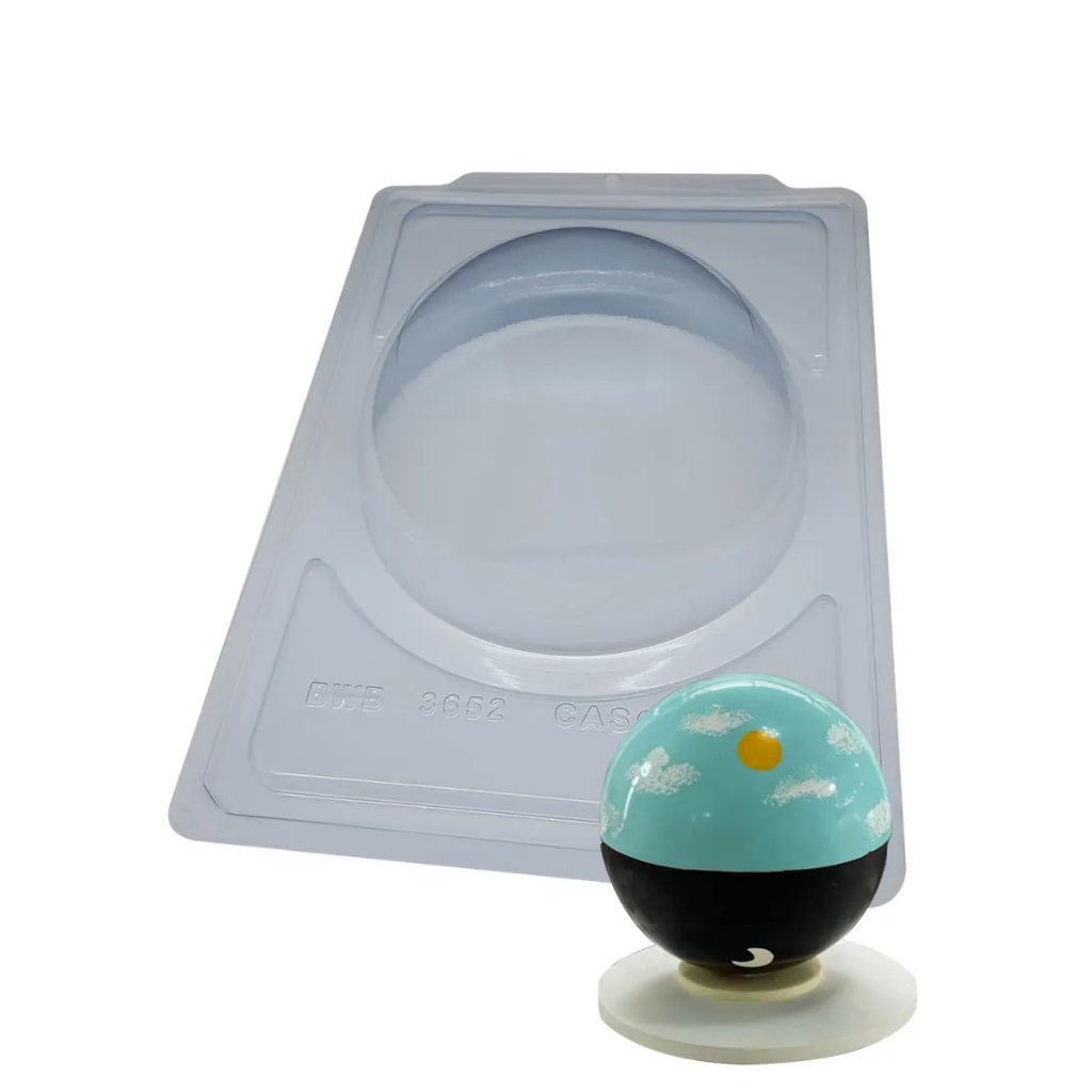 3652 - Esfera de 180mm (3652) Semiprofissional Especial Forma especial com silicone (3 partes), ideal para a produção de chocolates com muito mais praticidade e precisão. Mais informações do produto abaixo. mais informações Descrição do Produto Cavidades: 1 Diâm.: 180 x Alt.: 90 Peso Casquinha: 250g