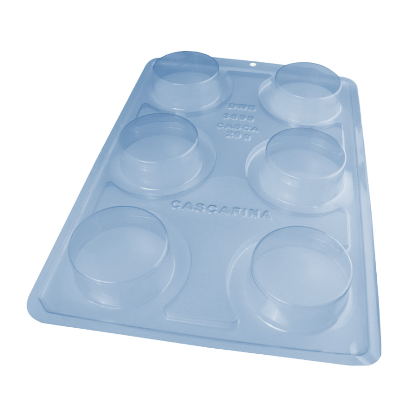 PÃO DE MEL GRANDE CASCA FINA CÓD: 3699 Forma Profissional, 3 partes (2 de acetato e 1 de silicone) ideal para produção de chocolates com muita precisão, praticidade e alto rendimento. Cavidades: 6 Unidades pacote: 1 Diâm.: 70 mm x Alt.: 23,5 mm Peso casca: 20 g Peso médio: 120 g
