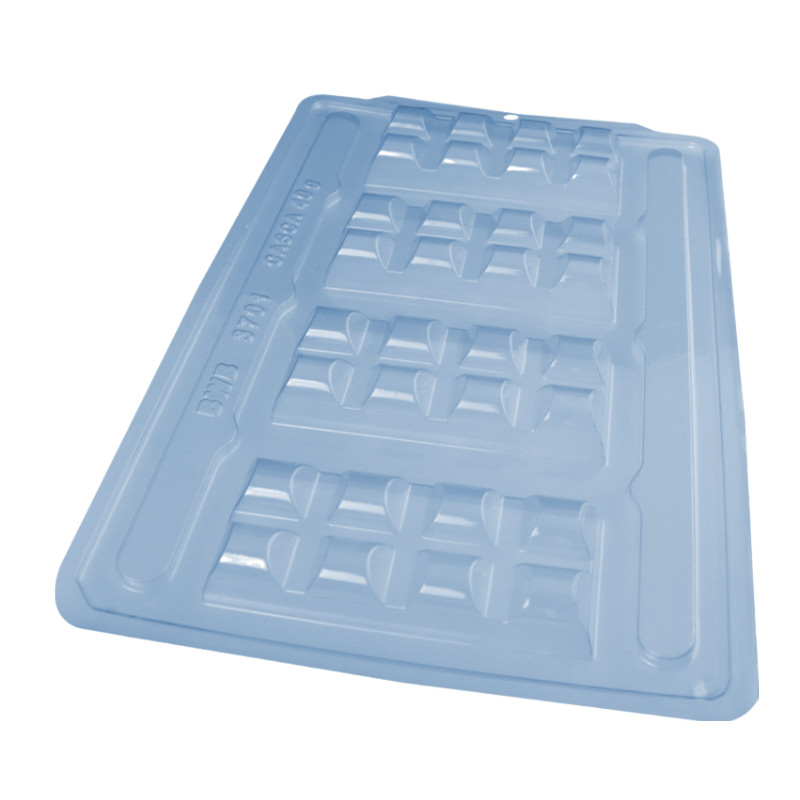TABLETE CASCA FINA CÓD: 3701 Forma Profissional, 3 partes (2 de acetato e 1 de silicone) ideal para produção de chocolates com muita precisão, praticidade e alto rendimento. Cavidades: 4 Unidades pacote: 1 unidade Comp.: 132,5 mm x Larg.: 55 mm x Alt.: 17 mm Peso casca: 40 g Peso médio: 150 g