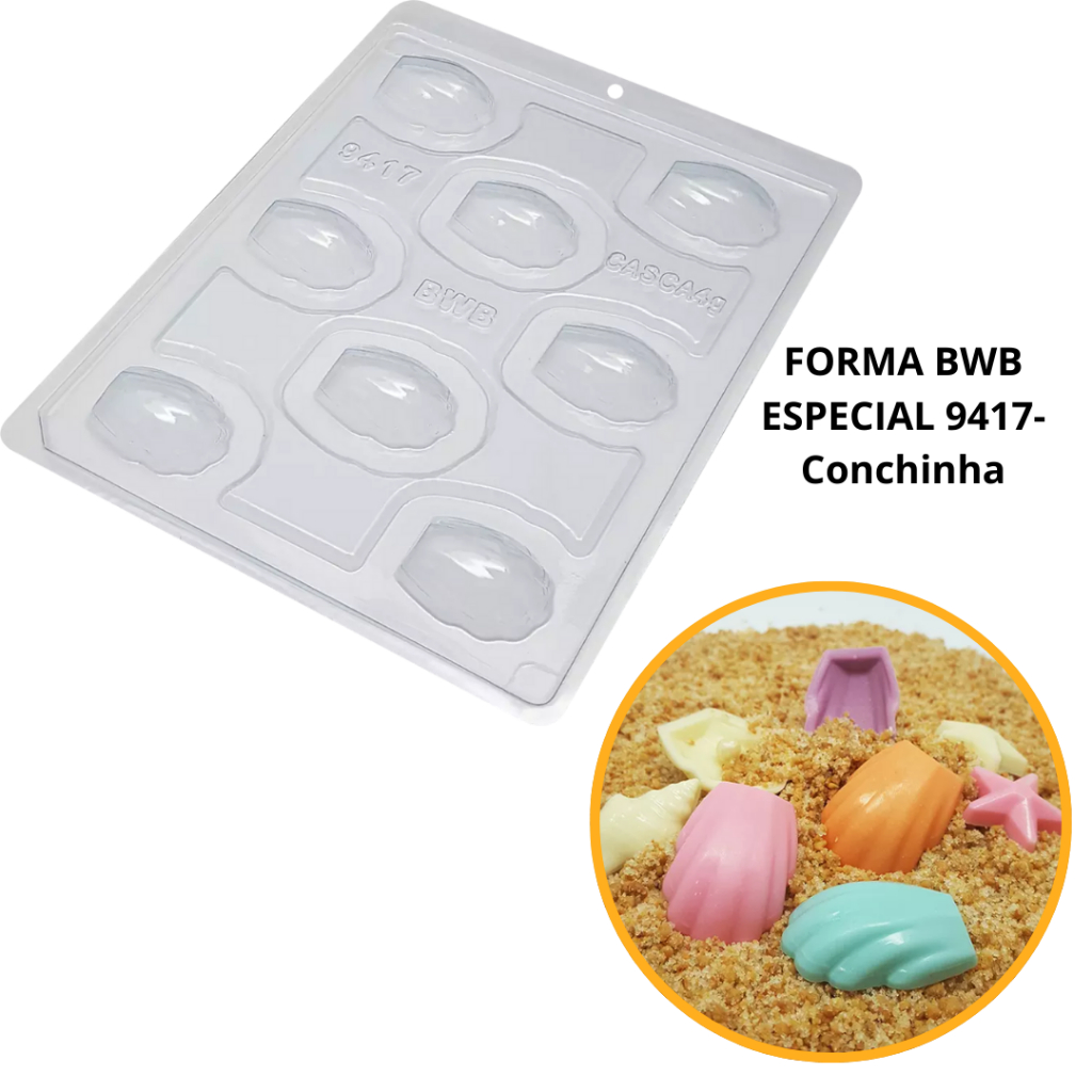 1~4 forma para chocolate bwb com silicone (3 partes) 9417 - Conchinha 20g festa fundo do mar (CHOCO)